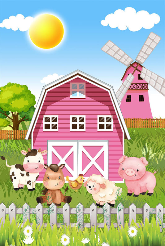 Pink Barn Cartoon Farm Animals Girl Birthday Party Backdrop